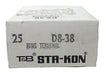 Thomas & Betts D8-38 Non-Insulated Large Brazed Seam Ring Terminal Connector - Qty. of 25. New in open box. Each box has a quantity of 25.